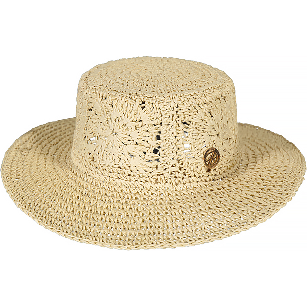 Teljes egészében kézzel horgolt női kalap papírból, szolid márkajelzéssel kiegészítve.